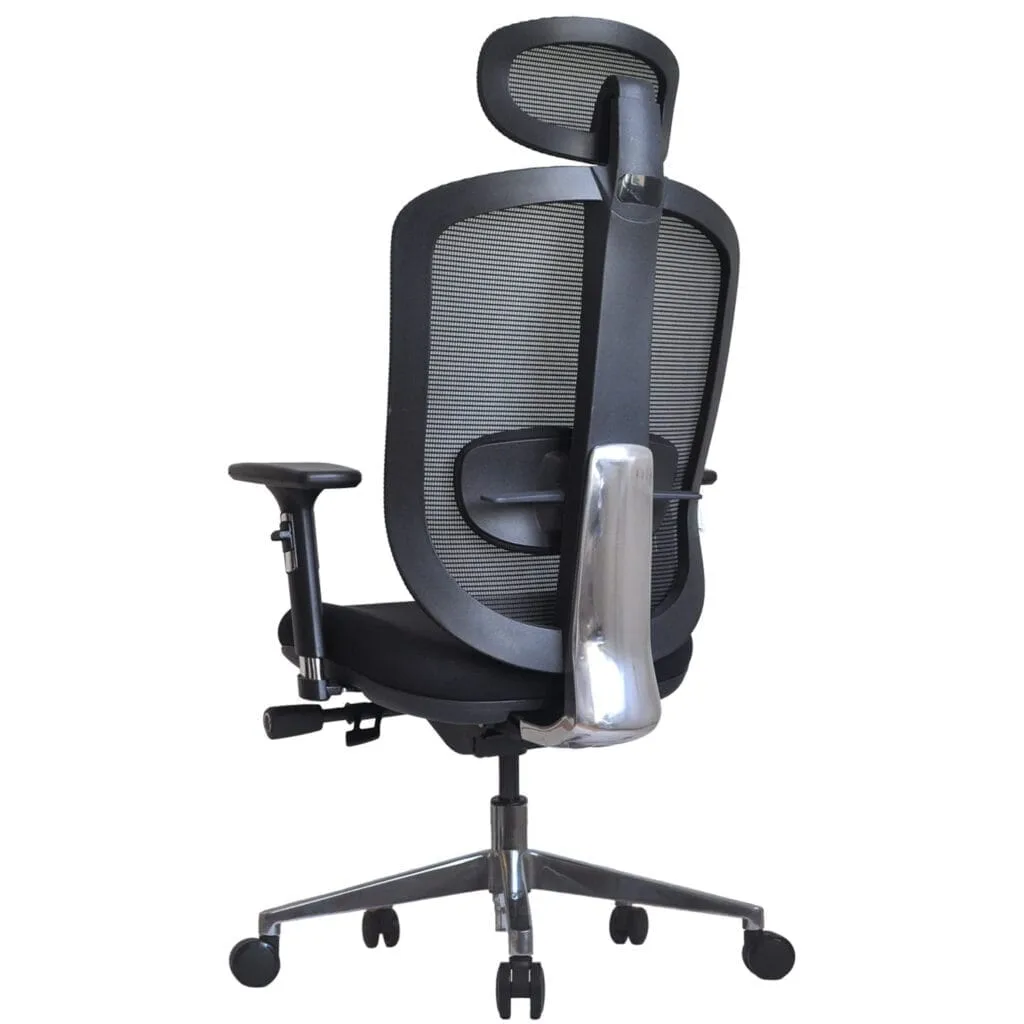 Die Kopfstütze ist in Höhe und Neigung verstellbar. Der ergonomische Bürostuhl ERGOS Premium verfügt über ein hochwertiges Aluminium-Fußkreuz mit Hochglanzoberfläche, das das elegante Design zusätzlich unterstreicht.