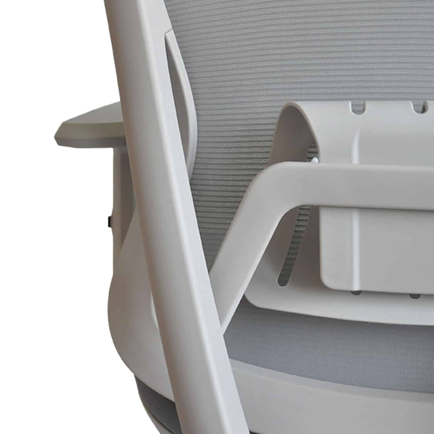 An der Rückseite der Rückenlehne befindet sich eine höhenverstellbare Lendenstütze. Die Höhe wird eingestellt, indem man die Lendenstütze mit beiden Händen festhält und nach oben oder unten bewegt.