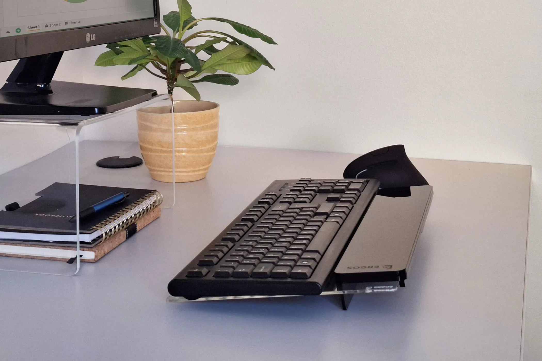 Elitype BASE 4 wird auf den Tisch gestellt und die Tastatur im gewünschten negativen Neigungswinkel (-8° bis -10°) darauf platziert. Für eine korrekte Ausrichtung der Arme sollten die Armlehnen des ergonomischen Stuhls etwas oberhalb der Tischhöhe und in einer Linie mit der Handballenauflage eingestellt sein, damit die Handgelenke in einer geraden, entlasteten Position bleiben.