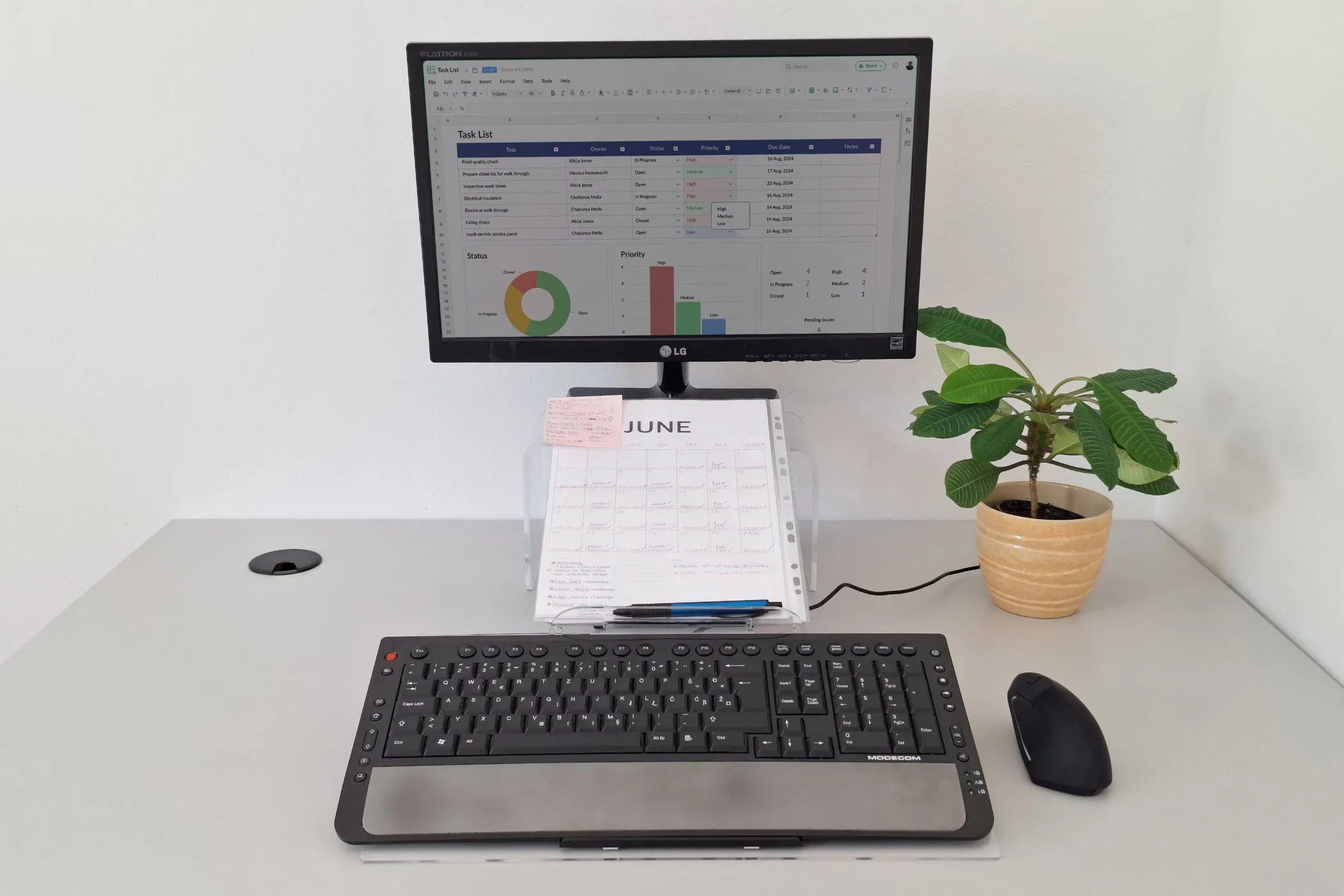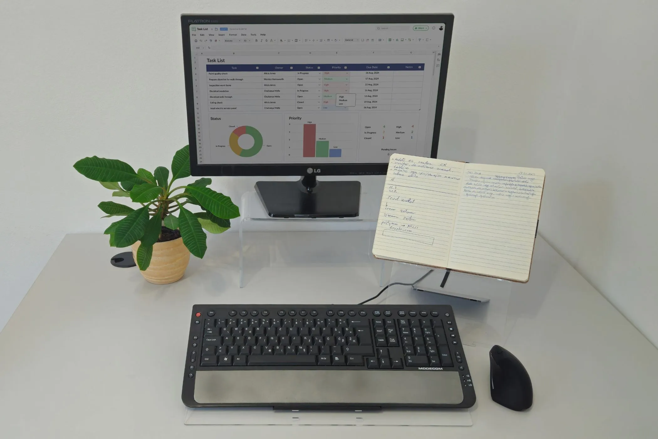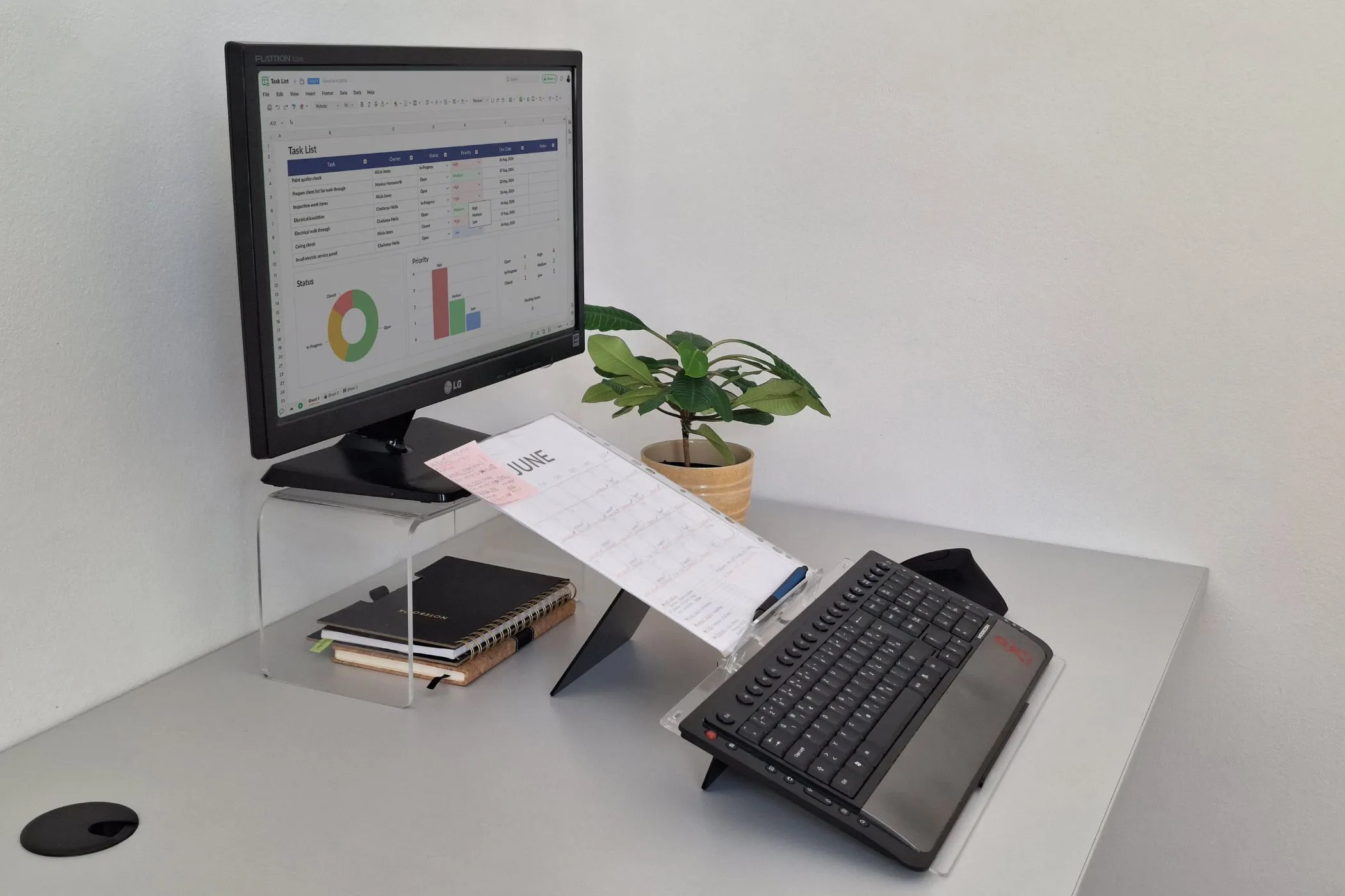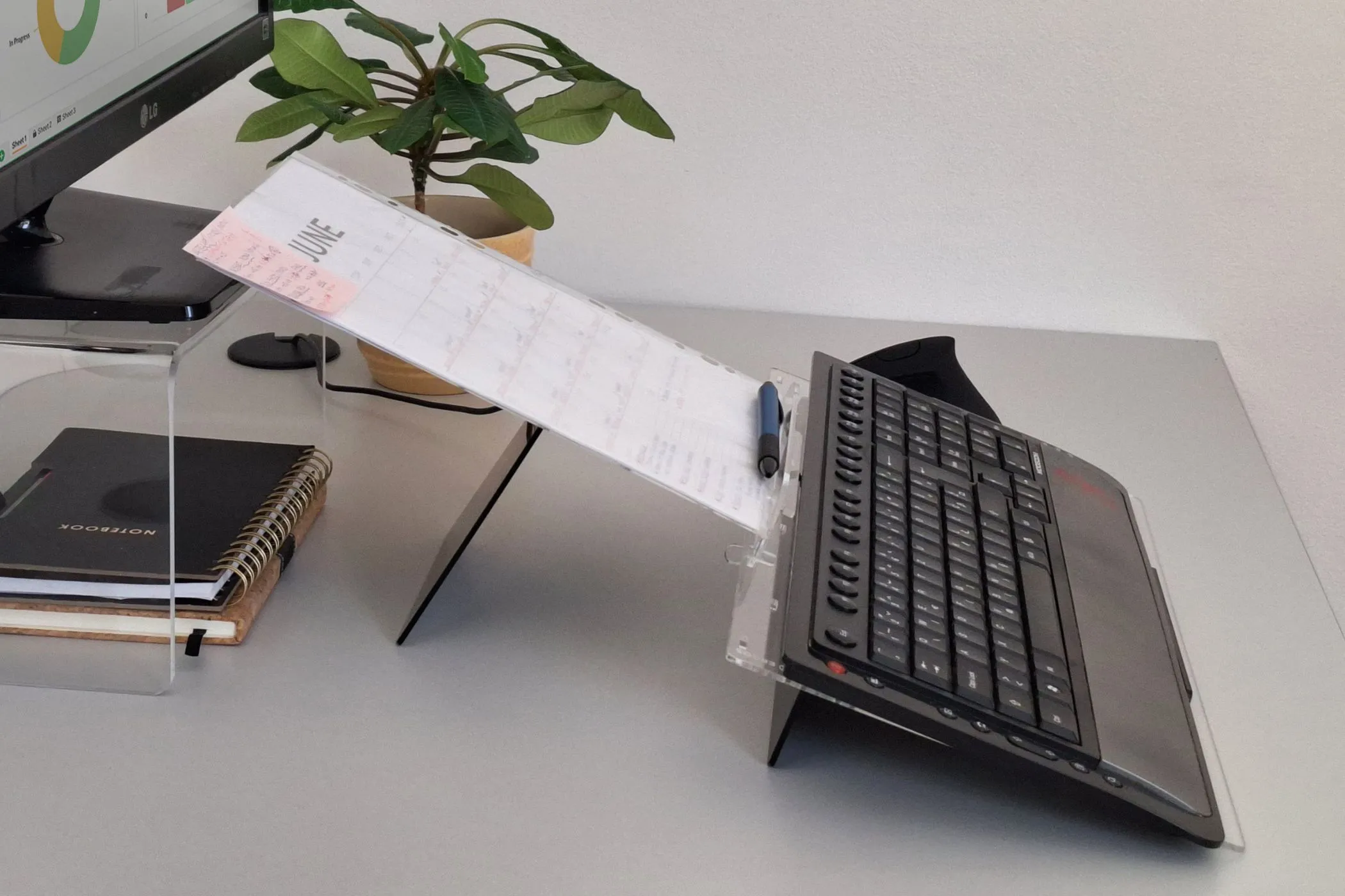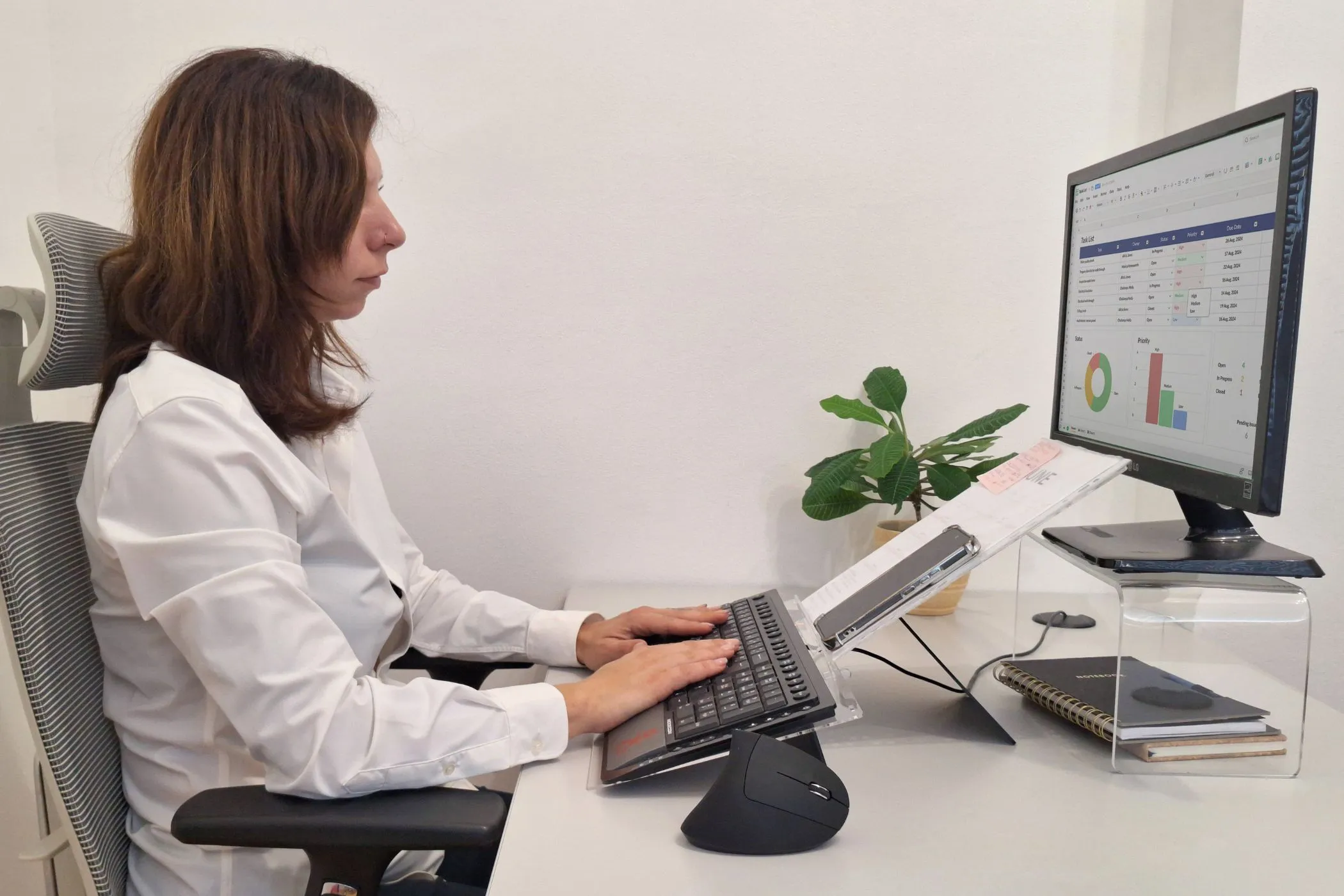 Elitype FLOW 1 wird auf den Tisch gestellt und die Tastatur in den gewünschten Neigungswinkel angehoben (14–18°). Das Dokument wird auf der Ablage platziert, die bei Bedarf näher an den Körper herangezogen oder weiter weg positioniert werden kann; zudem lässt sich der Neigungswinkel zwischen 15° und 50° einstellen.