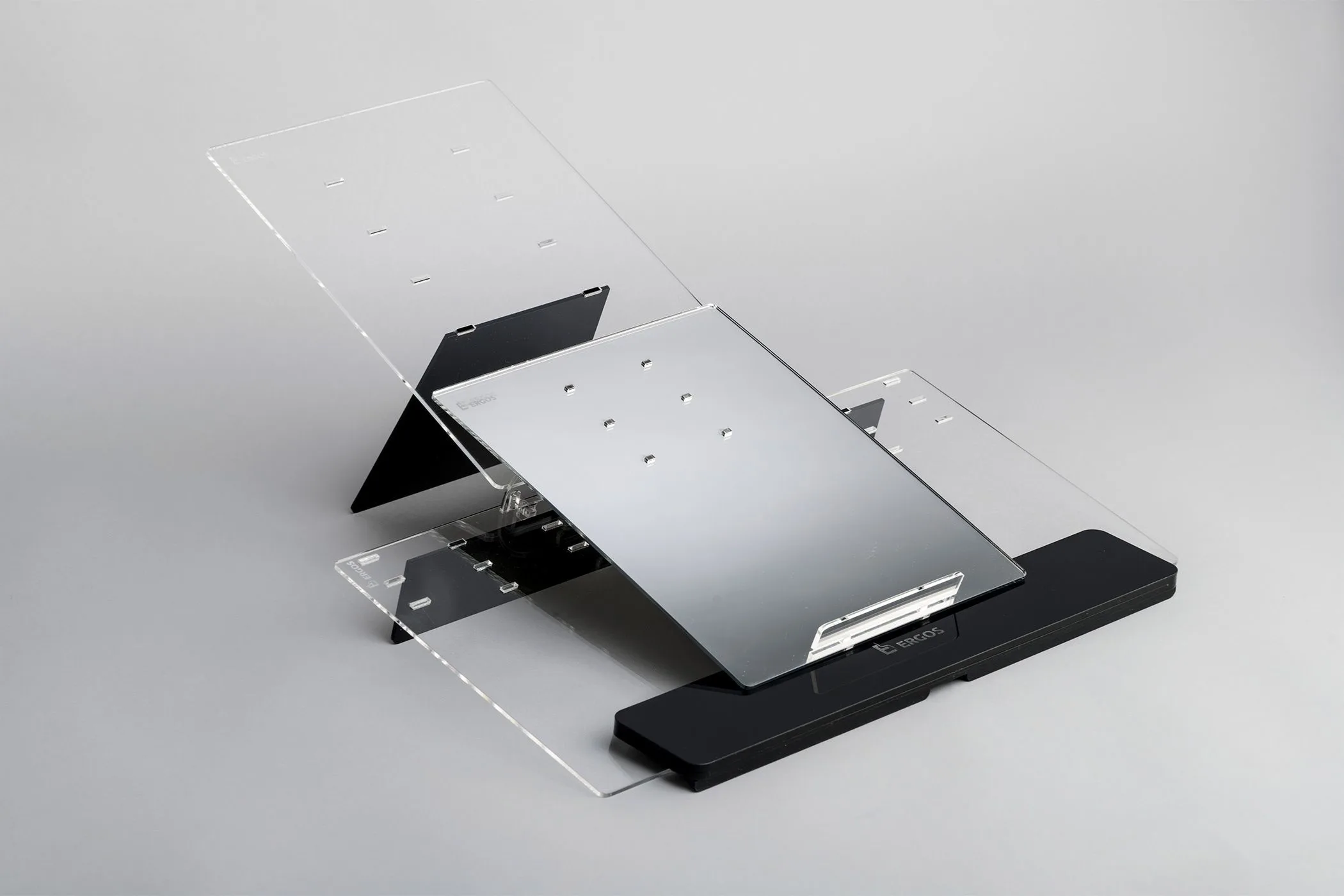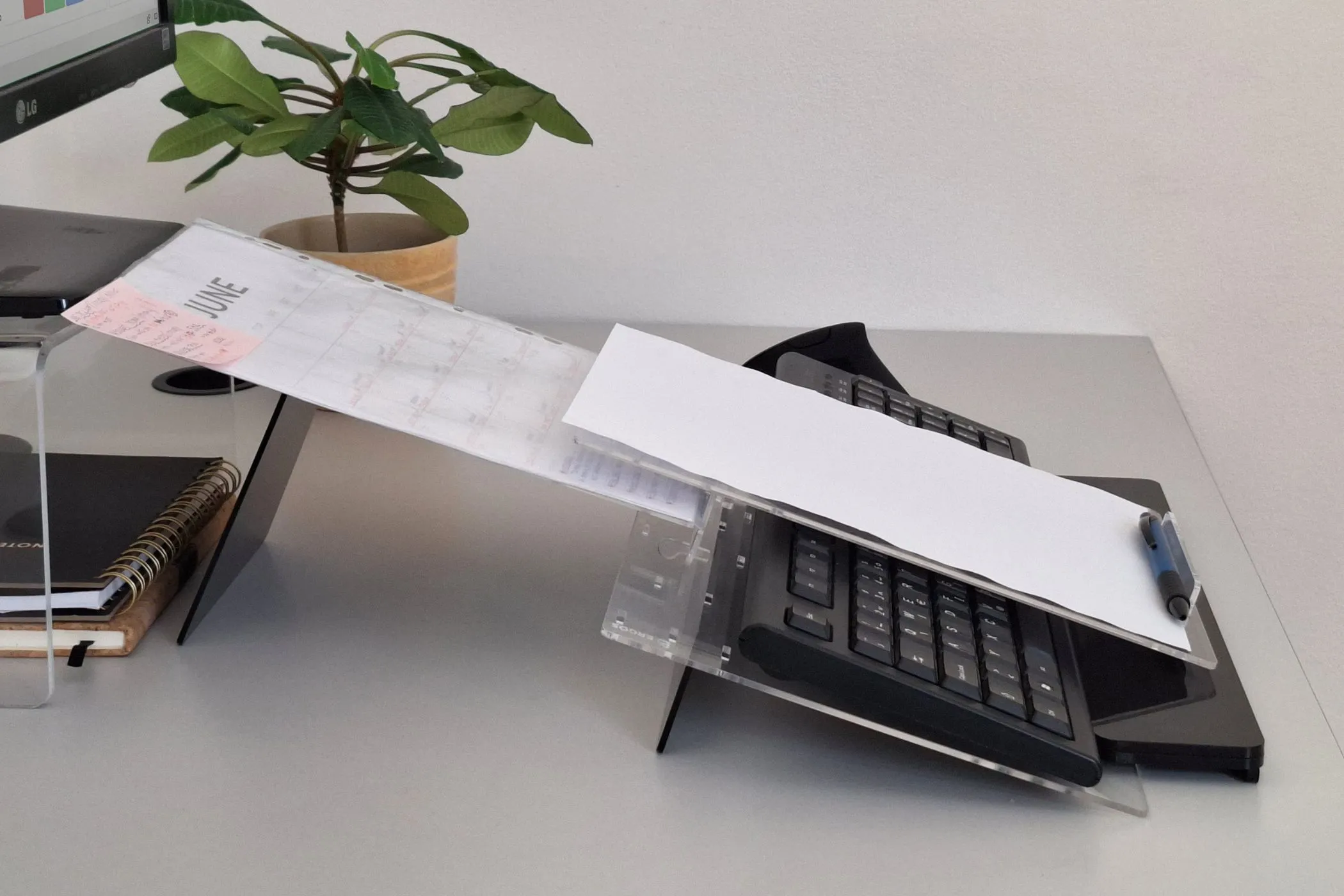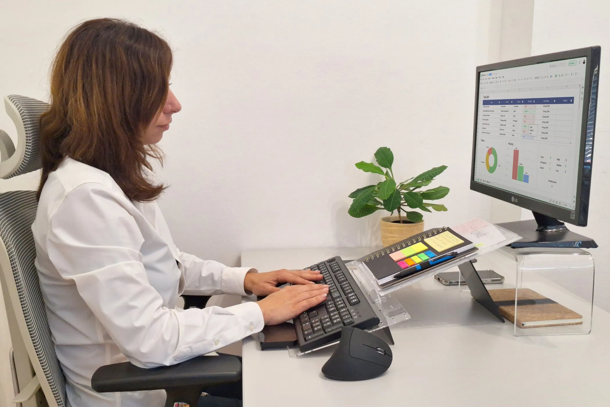 Elitype FLOW 2 ist ein ergonomischer Ständer für die gleichzeitige Arbeit mit Tastatur und Dokumenten, entwickelt für bessere Übersicht und eine korrekte Körperhaltung bei der Arbeit mit Papierunterlagen. Die Tastatur wird in einen positiven Neigungswinkel von 14° bis 18° angehoben, die Dokumente werden in die Blicklinie positioniert, wodurch das Nach vorne Beugen reduziert und Nacken, Schultern sowie der obere Rücken entlastet werden.