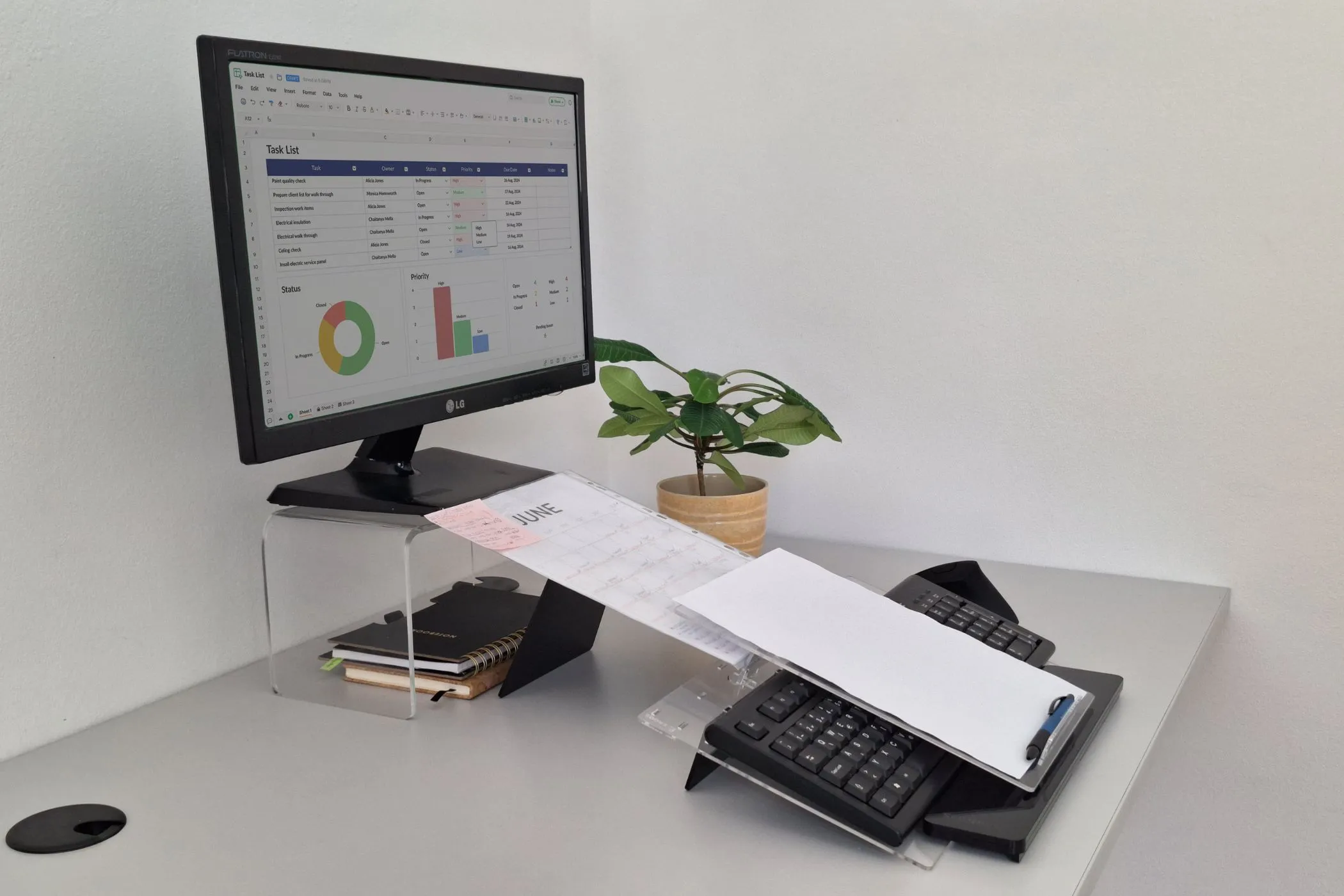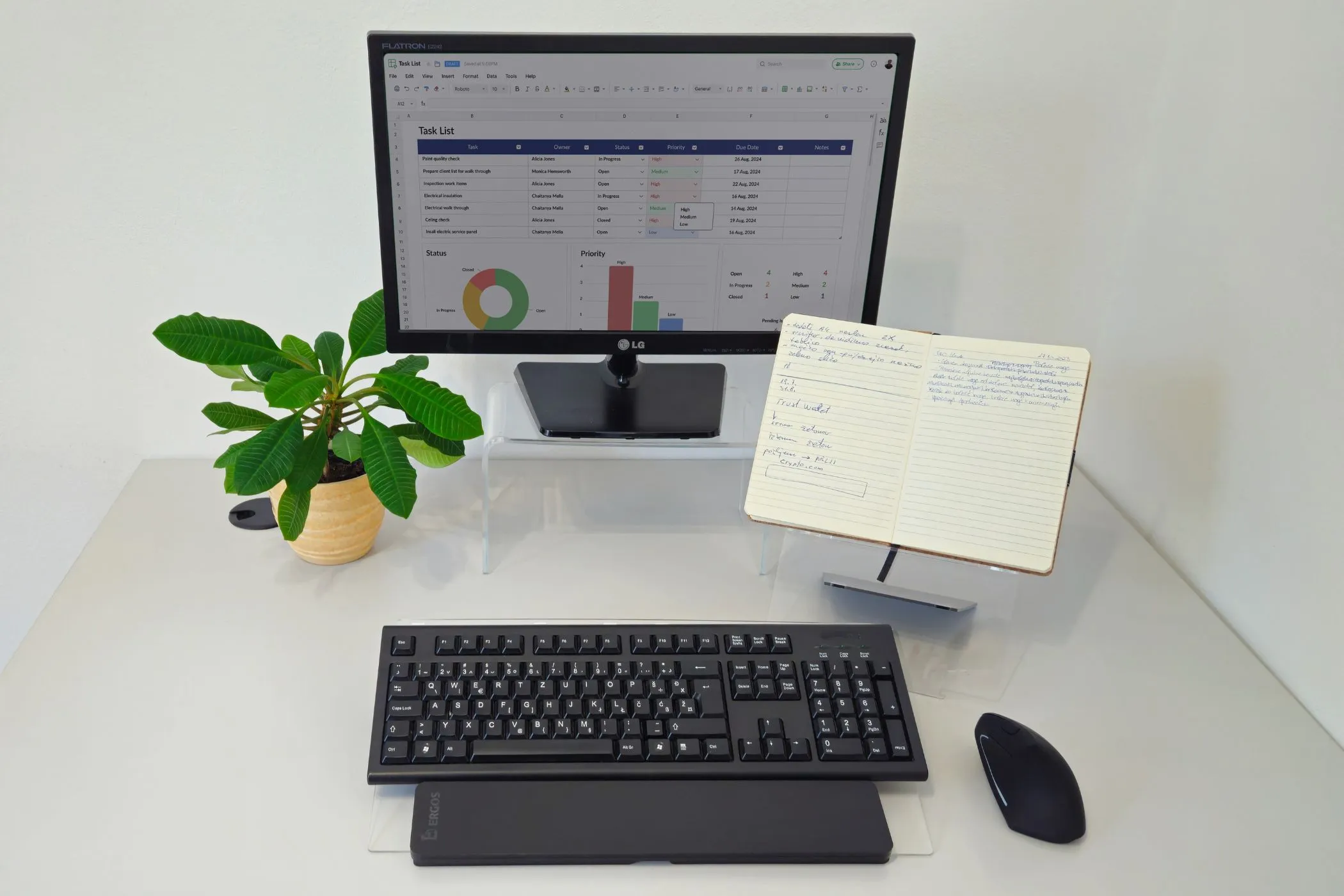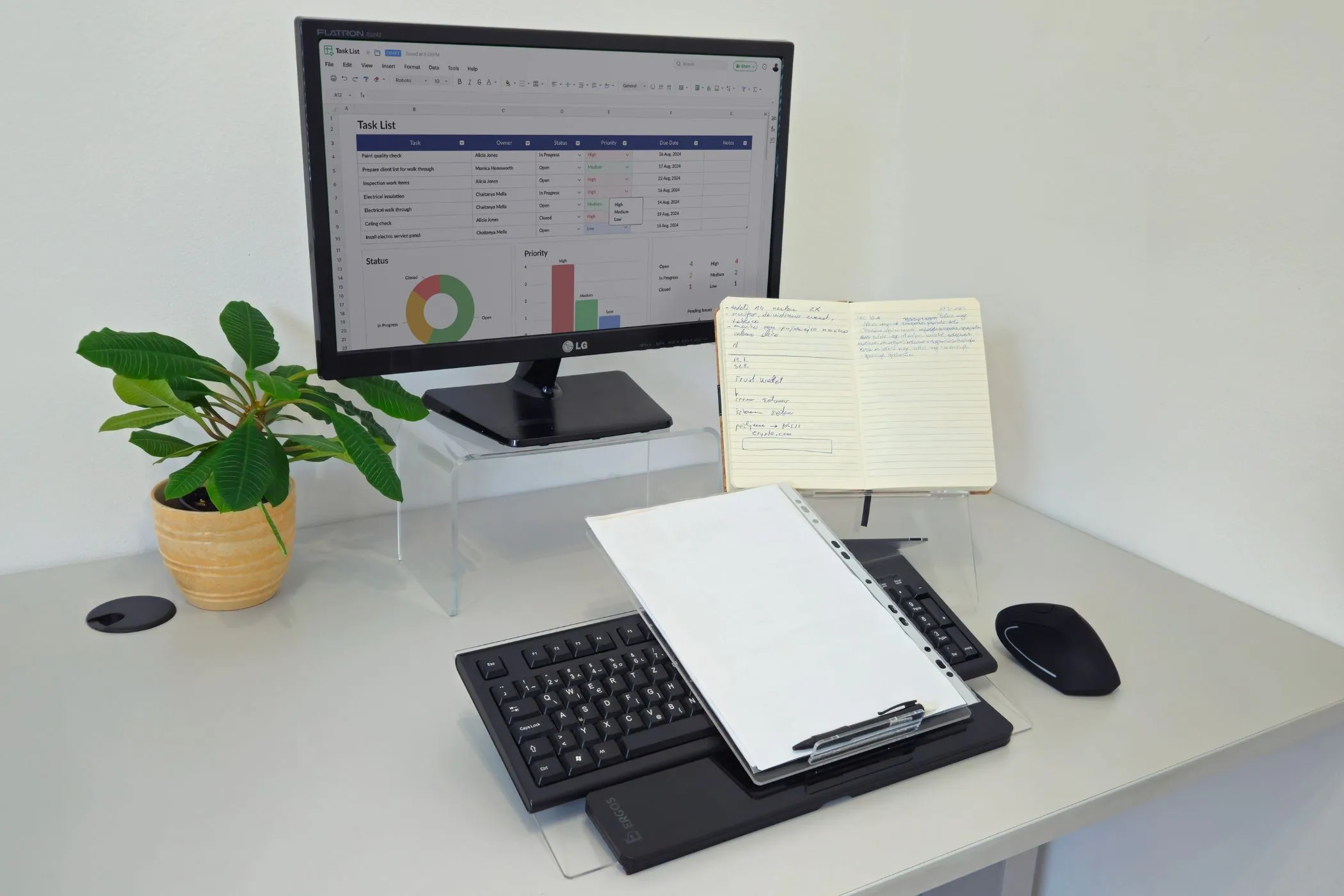 Elitype FLOW 2 ist ein ergonomischer Ständer für die gleichzeitige Arbeit mit Tastatur und Dokumenten, entwickelt für bessere Übersicht und eine korrekte Körperhaltung bei der Arbeit mit Papierunterlagen. Die Tastatur wird in einen positiven Neigungswinkel von 14° bis 18° angehoben, die Dokumente werden in die Blicklinie positioniert, wodurch das Nach vorne Beugen reduziert und Nacken, Schultern sowie der obere Rücken entlastet werden.