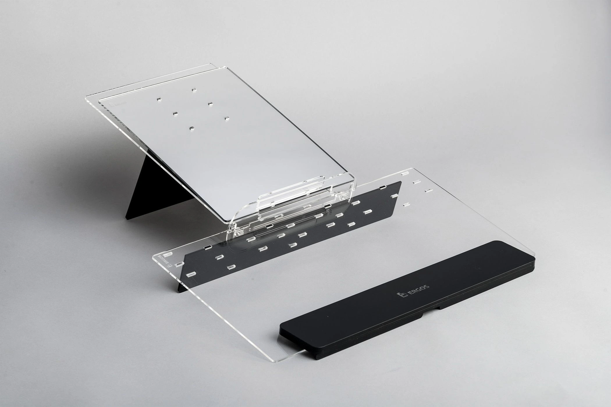 Sie ermöglicht die Einstellung des Neigungswinkels und des Abstands der Tastatur zur Tischoberfläche, sowohl an der Vorder als auch an der Rückseite. Dadurch wird die Sicht auf die Tasten verbessert und das Vorbeugen reduziert. Die Auflage lässt sich einfach so positionieren, wie es für den Nutzer am besten passt.