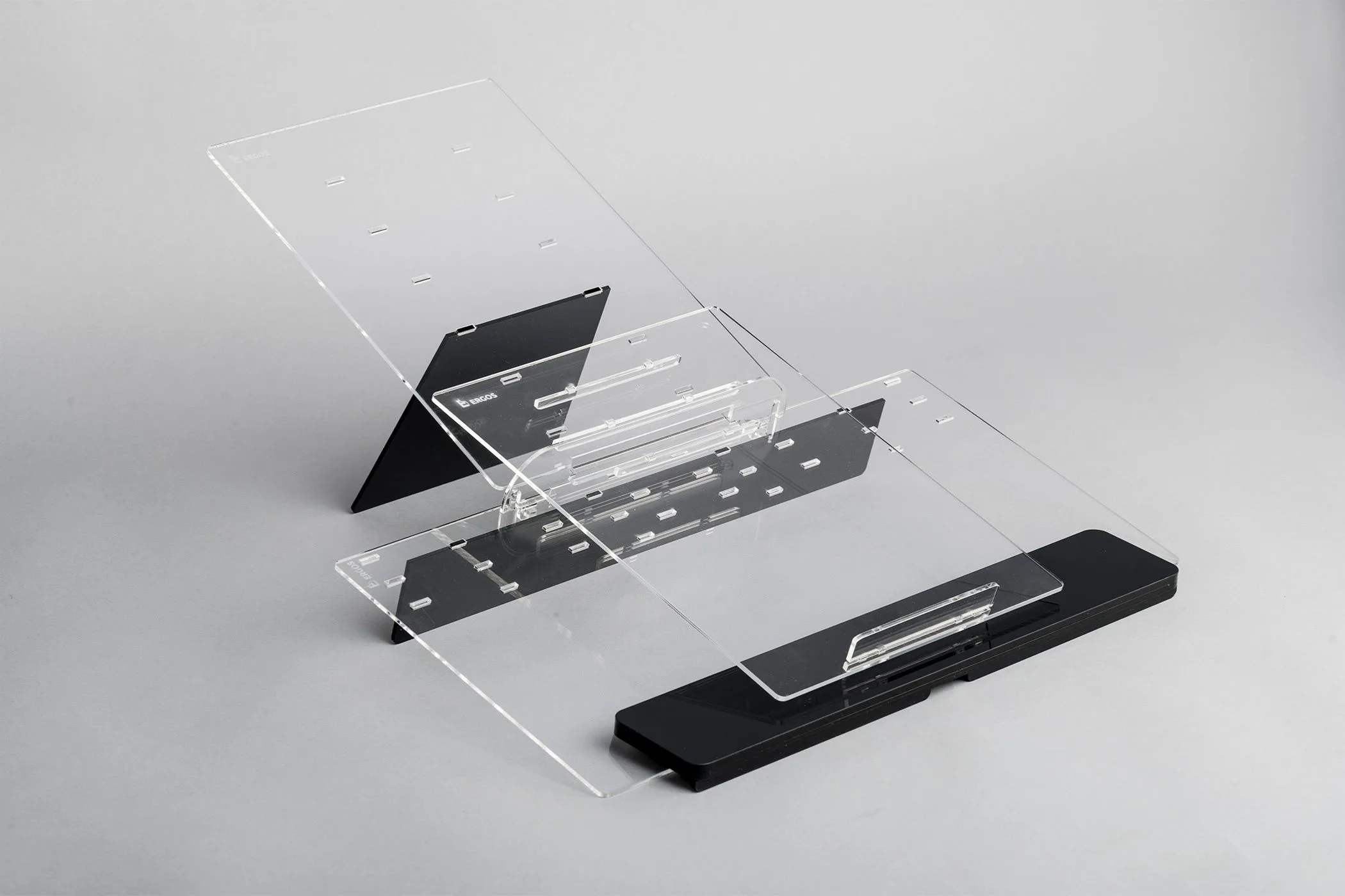 Elitype FLOW 2 wird auf den Tisch gestellt und die Tastatur in den gewünschten Neigungswinkel angehoben (14–18°). Das Dokument wird auf der Ablage platziert, die näher herangezogen oder weiter entfernt sowie im Neigungswinkel zwischen 15° und 50° eingestellt werden kann.