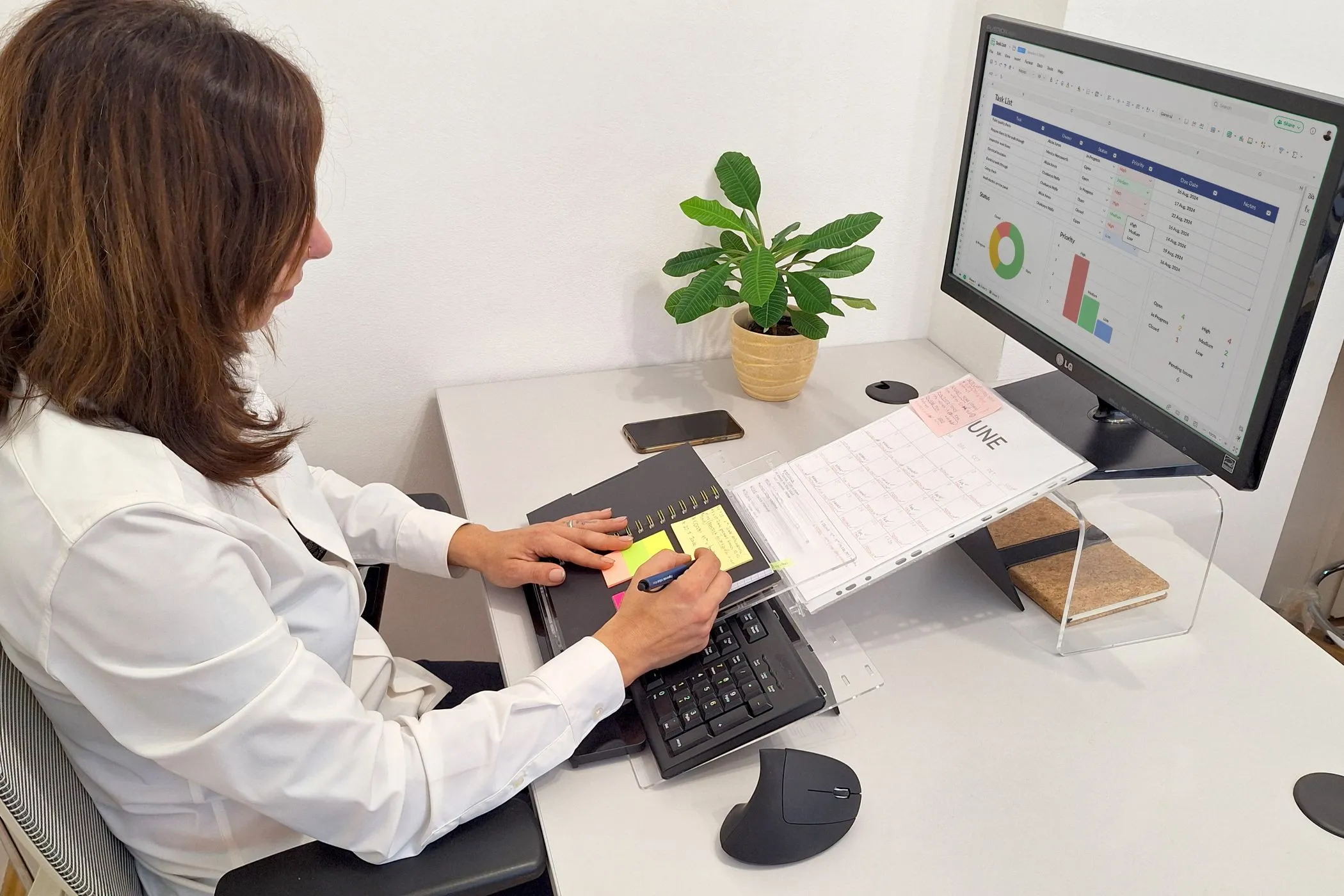 Die Handballenauflage unterstützt die Handgelenke, während die mobile Ablage das Schreiben direkt über der Tastatur ermöglicht, ohne den Körper zu drehen oder sich nach vorne zu beugen.