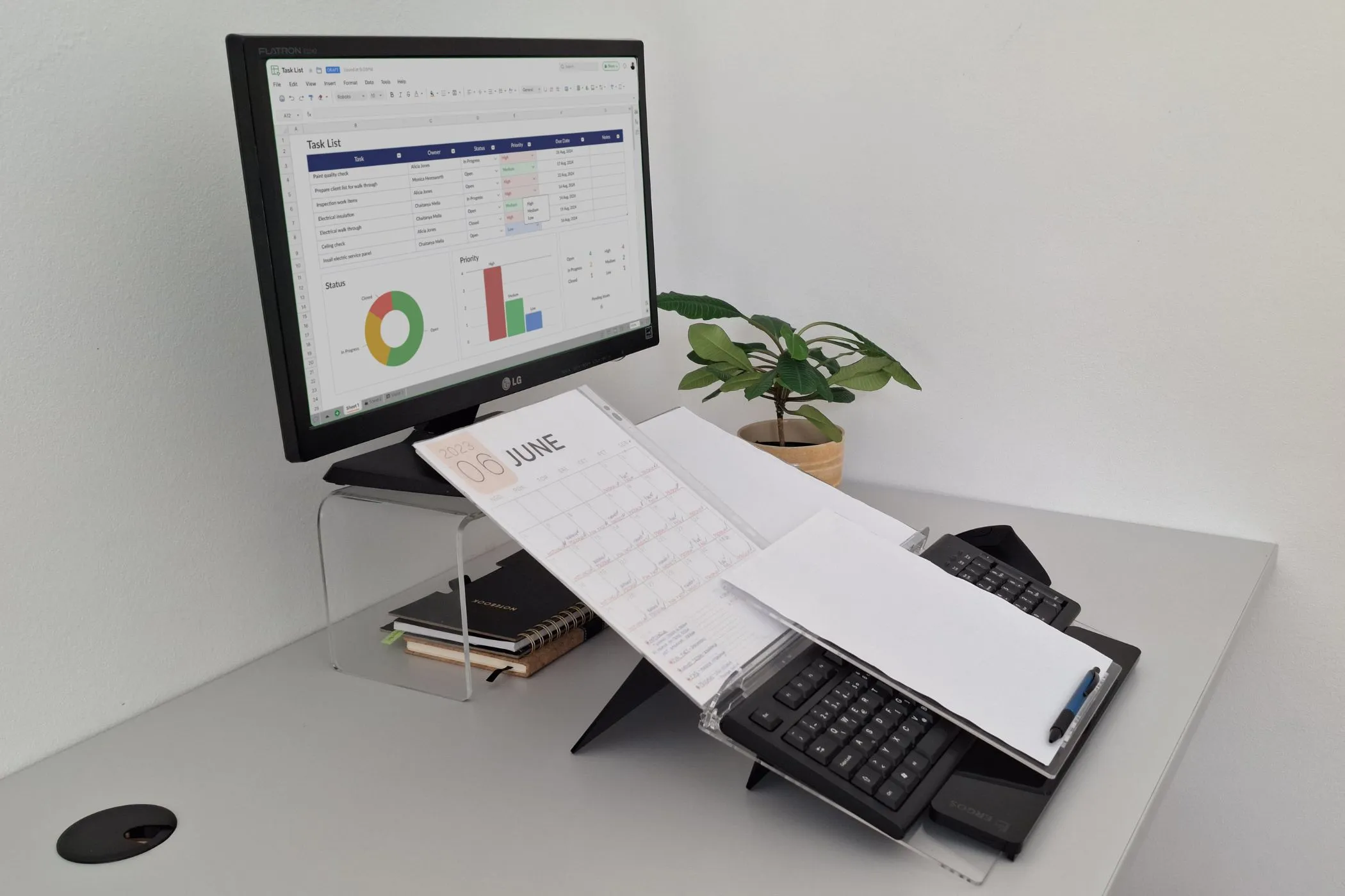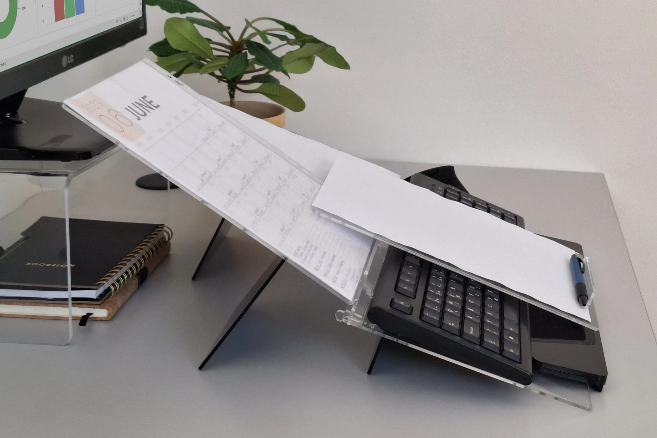 Sie ermöglicht die Einstellung des Neigungswinkels und des Abstands der Tastatur zur Tischoberfläche, sowohl an der Vorder als auch an der Rückseite. Dadurch wird die Sicht auf die Tasten verbessert und das Vorbeugen reduziert. Die Auflage lässt sich einfach so positionieren, wie es für den Nutzer am besten passt.