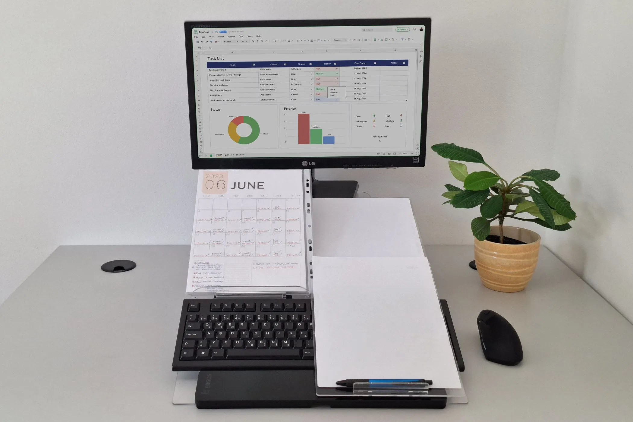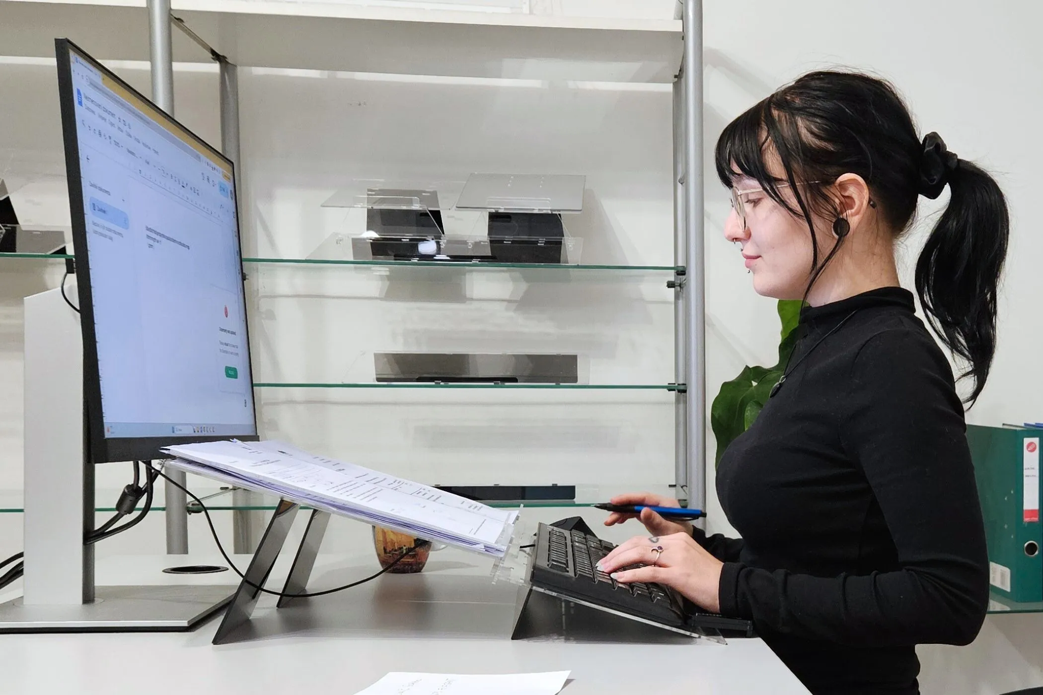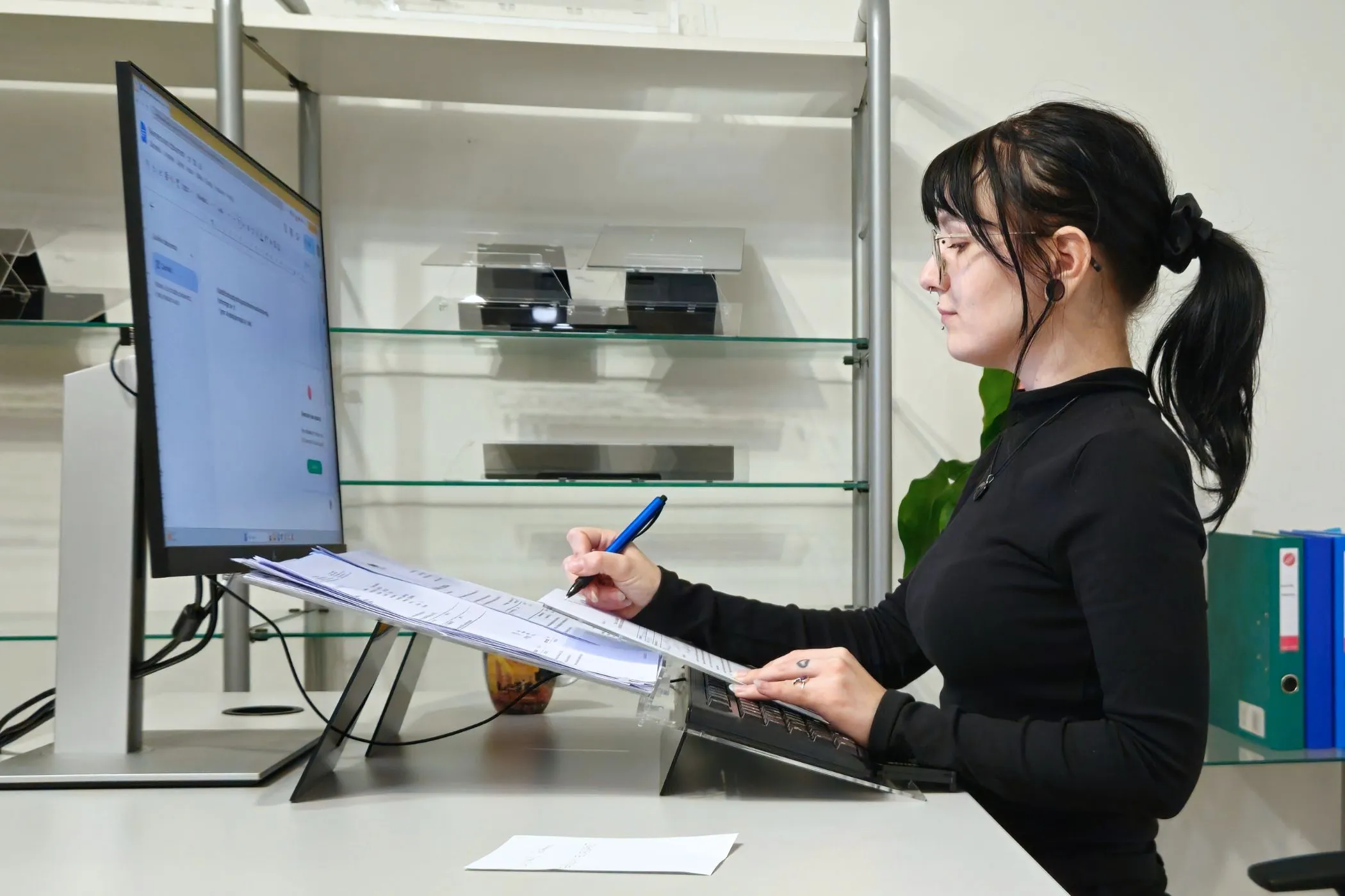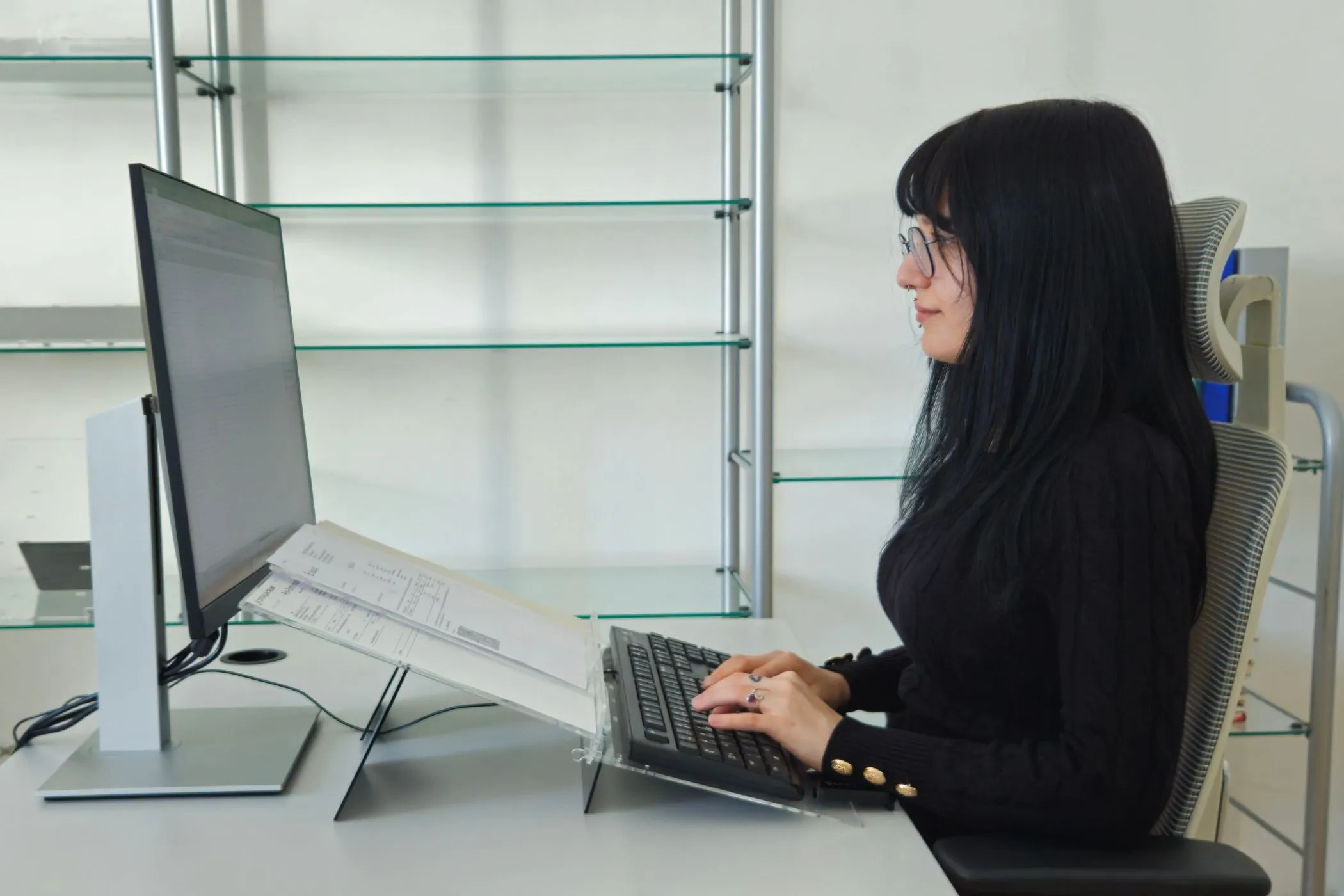 Elitype FLOW 4 wird auf den Tisch gestellt und die Tastatur in den gewünschten Neigungswinkel angehoben (14–18°) . Die Dokumente werden auf den Ablagen platziert, deren Neigungswinkel zwischen 15° und 50° eingestellt werden kann.