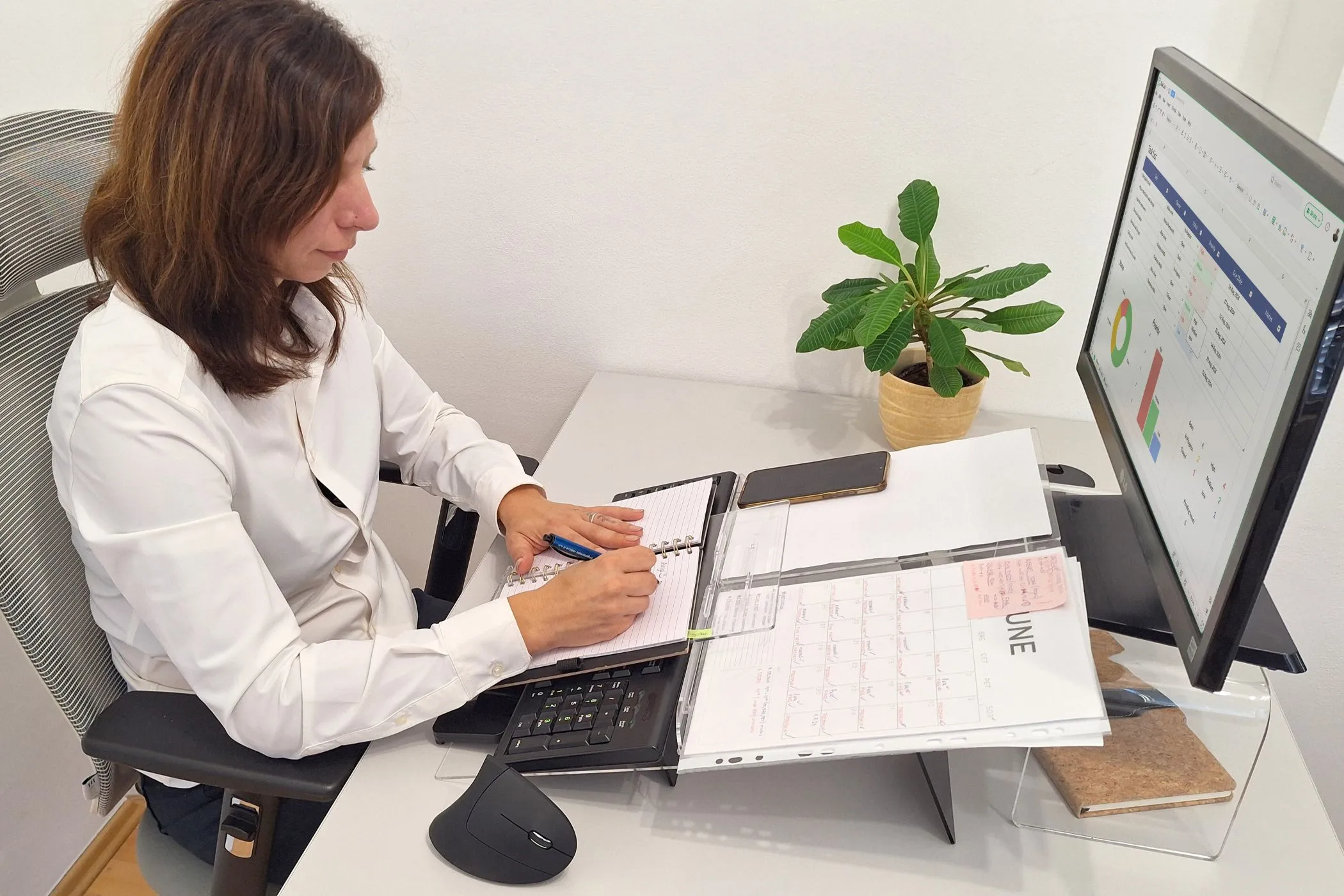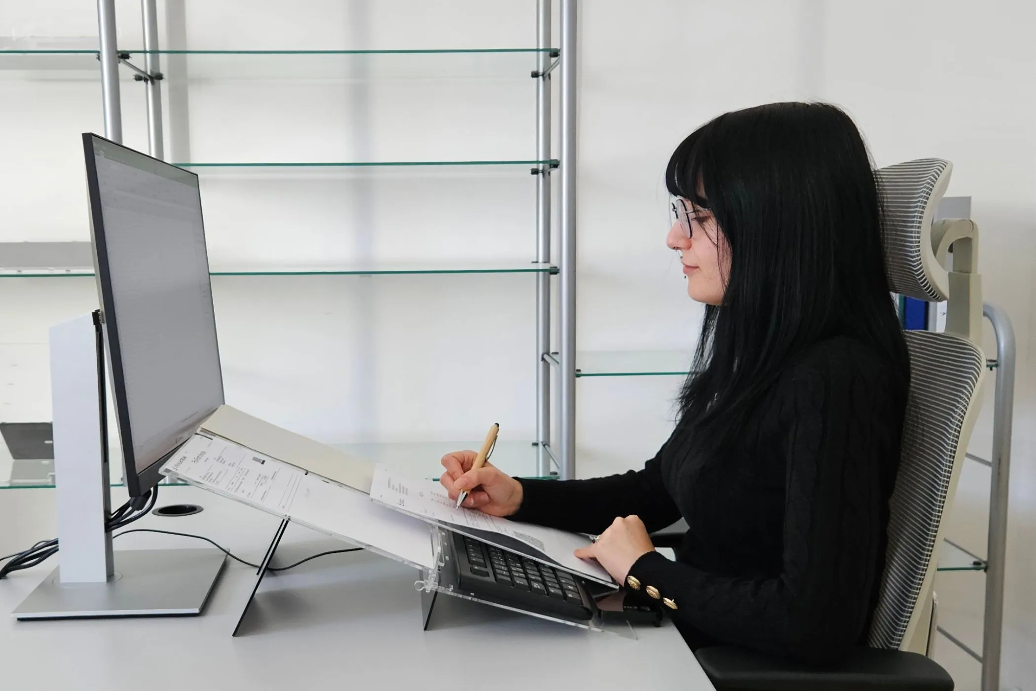 Die Handballenauflage unterstützt die Handgelenke, während die mobile Ablage das Schreiben direkt über der Tastatur ermöglicht, ohne den Körper zu drehen oder sich nach vorne zu beugen.