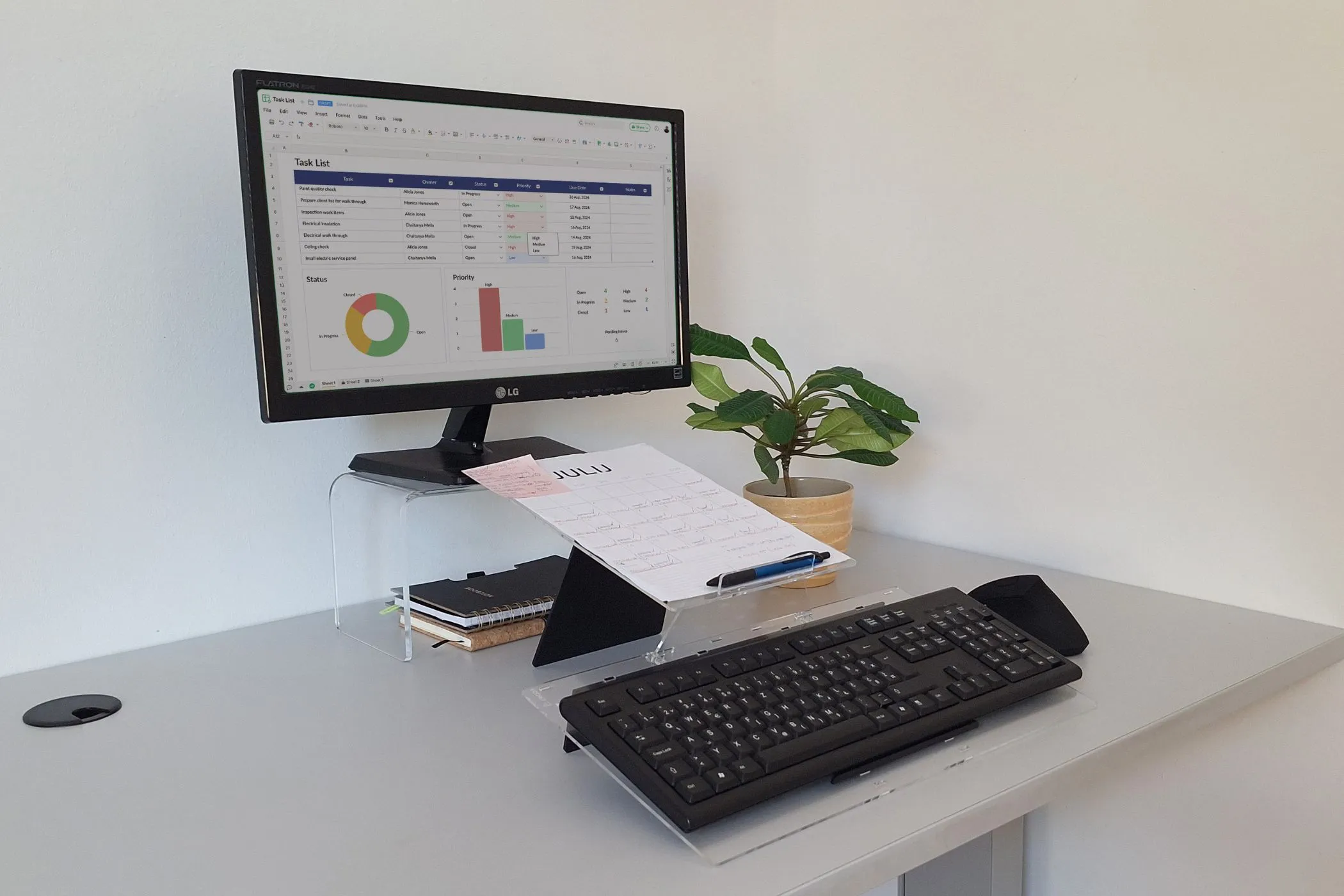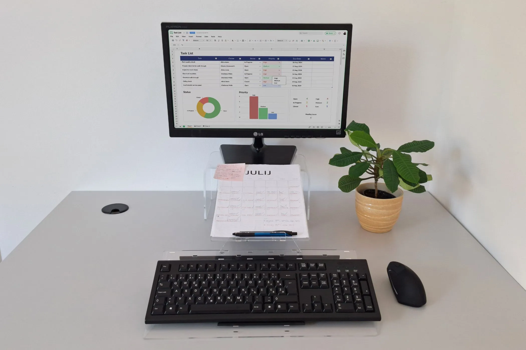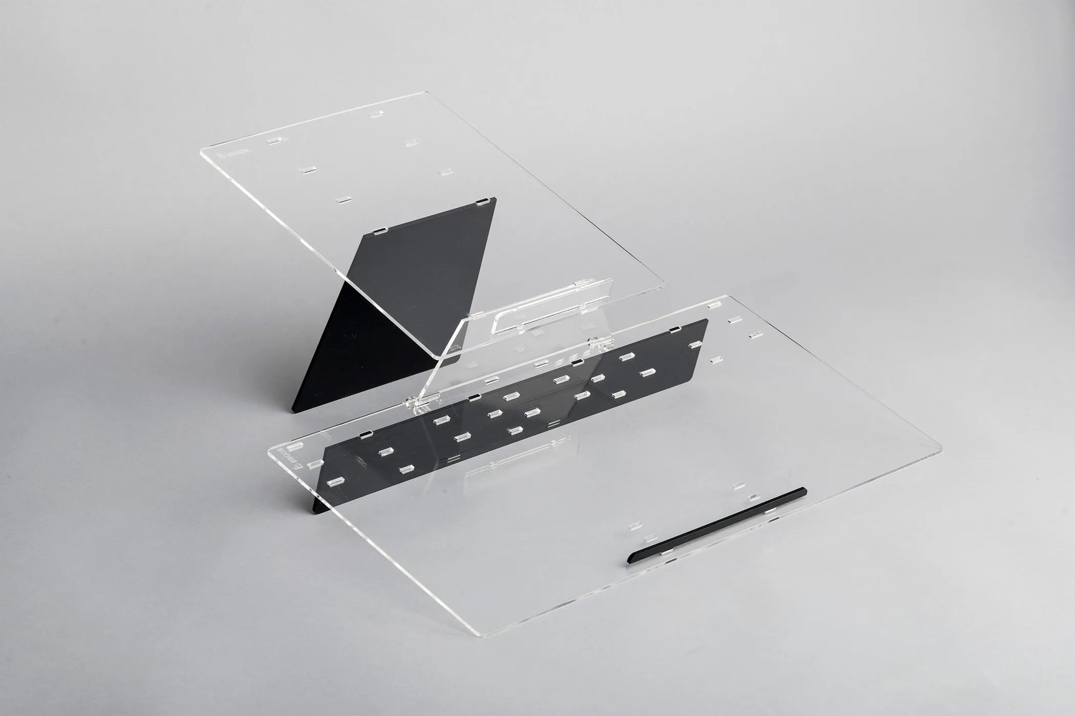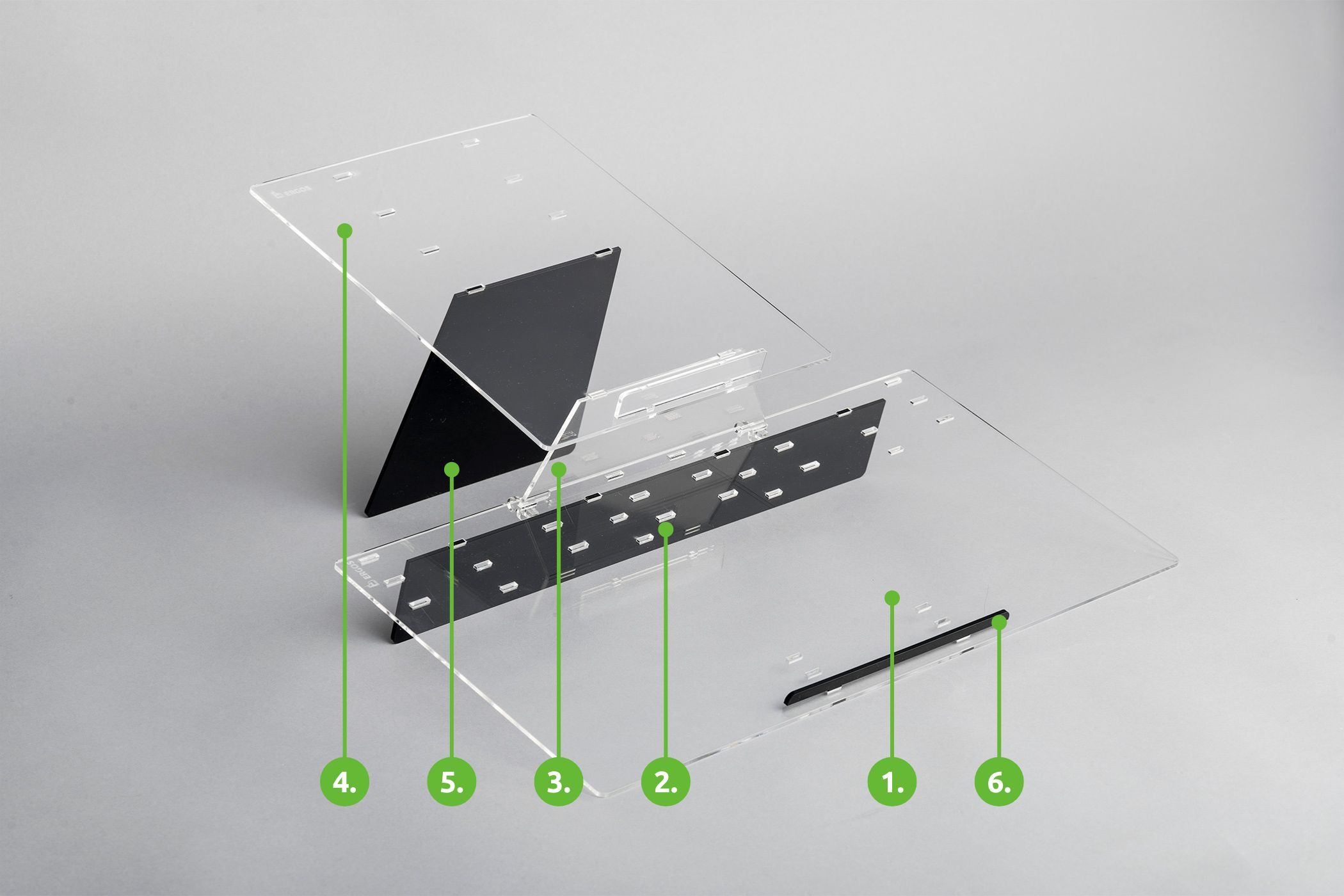 Sie ermöglicht die Einstellung des Neigungswinkels und des Abstands der Tastatur zur Tischoberfläche, sowohl an der Vorder als auch an der Rückseite. Dadurch wird die Sicht auf die Tasten verbessert und das Vorbeugen reduziert. Die Auflage lässt sich einfach so positionieren, wie es für den Nutzer am besten passt.