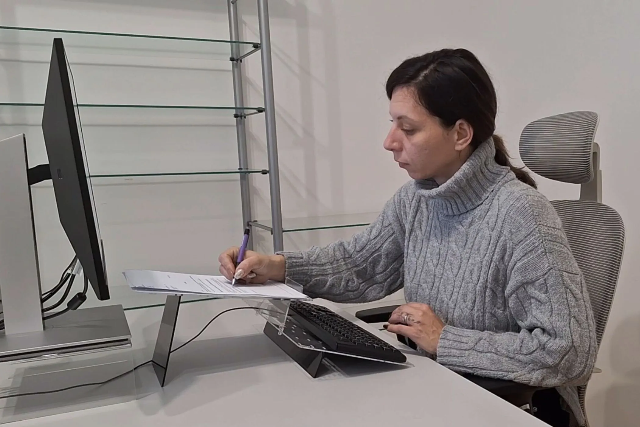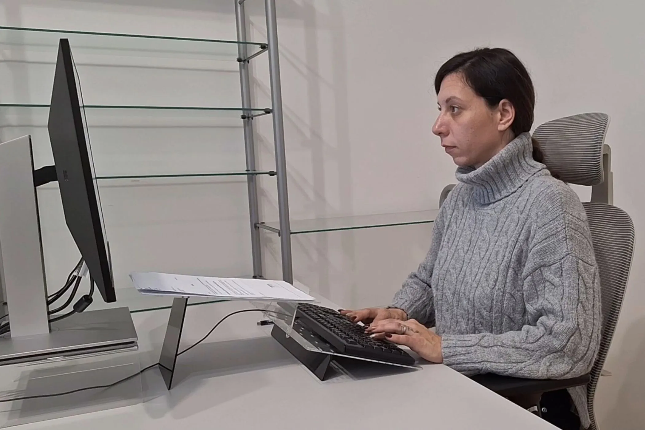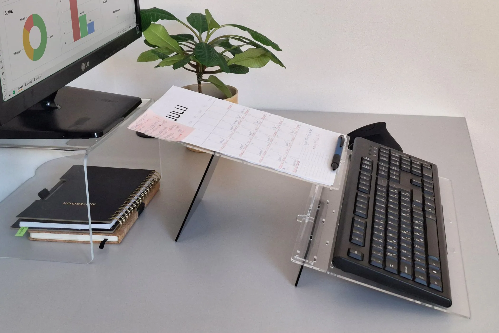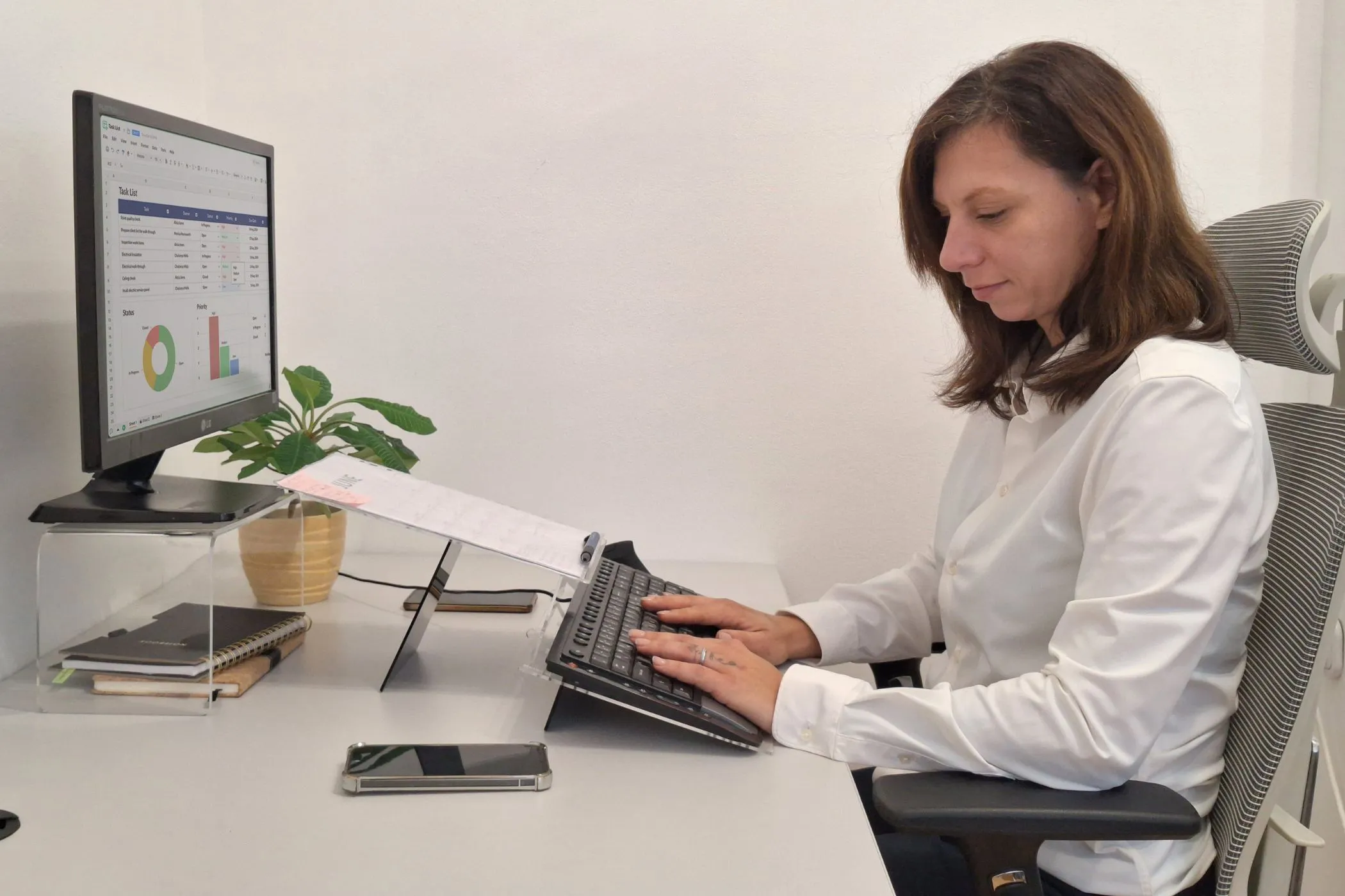Elitype ZEN 1 wird auf den Tisch gestellt, und die Tastatur wird in den gewünschten Neigungswinkel angehoben (14–18°), um eine bessere Übersicht über die Tasten zu erhalten. Dokumente werden auf der Ablage platziert, deren Neigungswinkel (8–18°) sowie der Abstand zum Benutzer angepasst werden können.