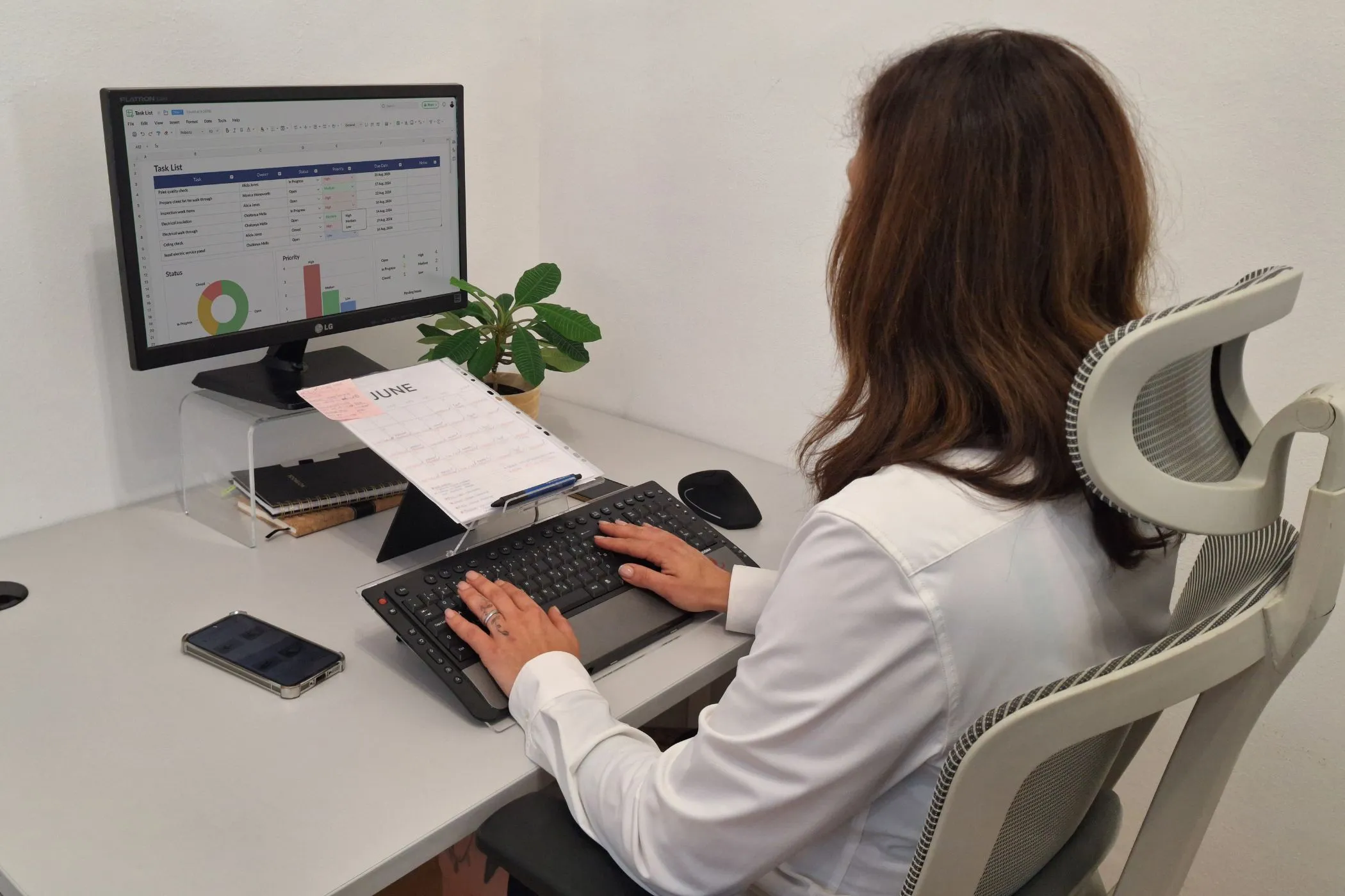 Für eine komfortable Arbeitshaltung sollten die Armlehnen des Stuhls etwas unterhalb der Tischhöhe eingestellt sein, damit die Arme in einer Linie mit der Tastatur bleiben.