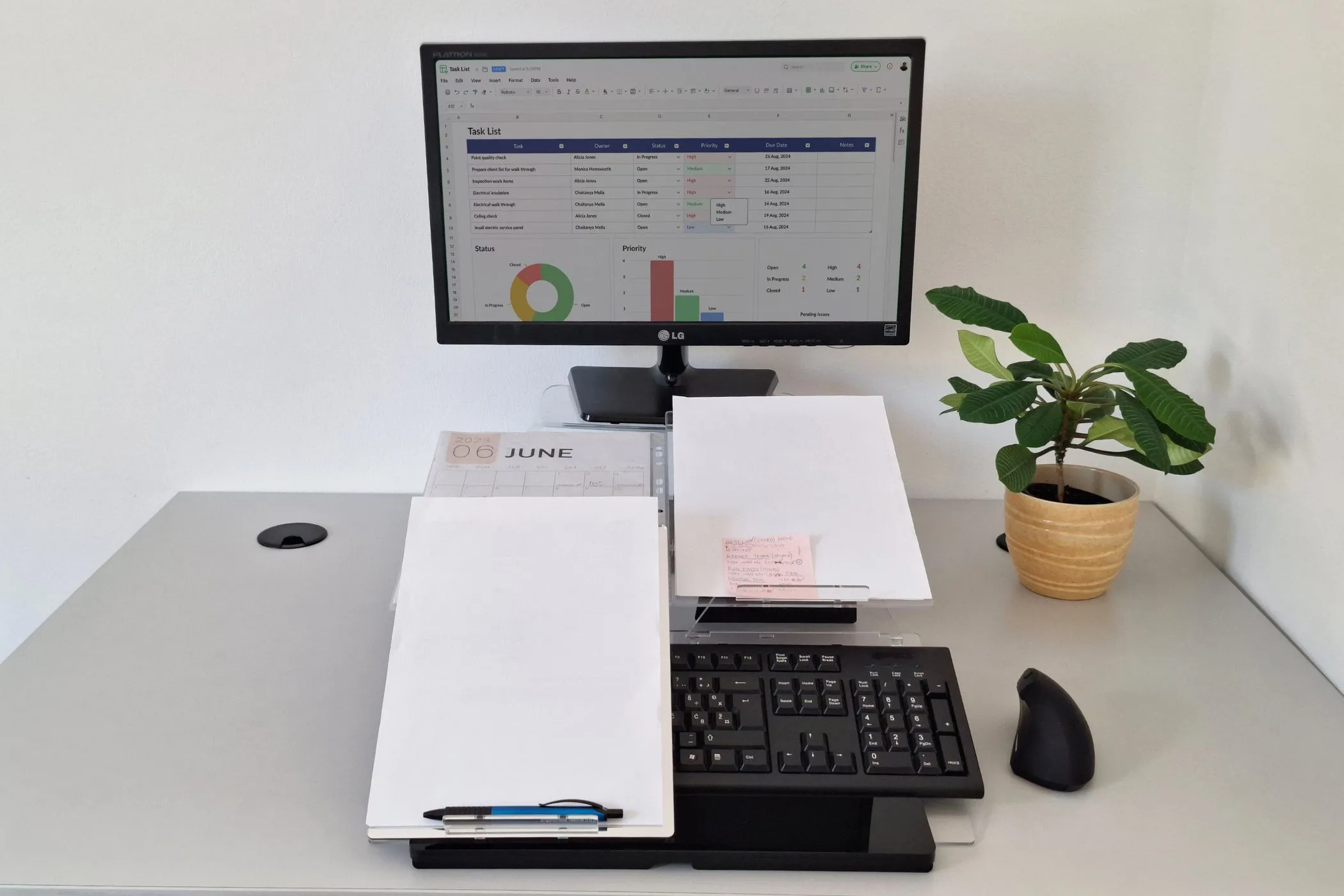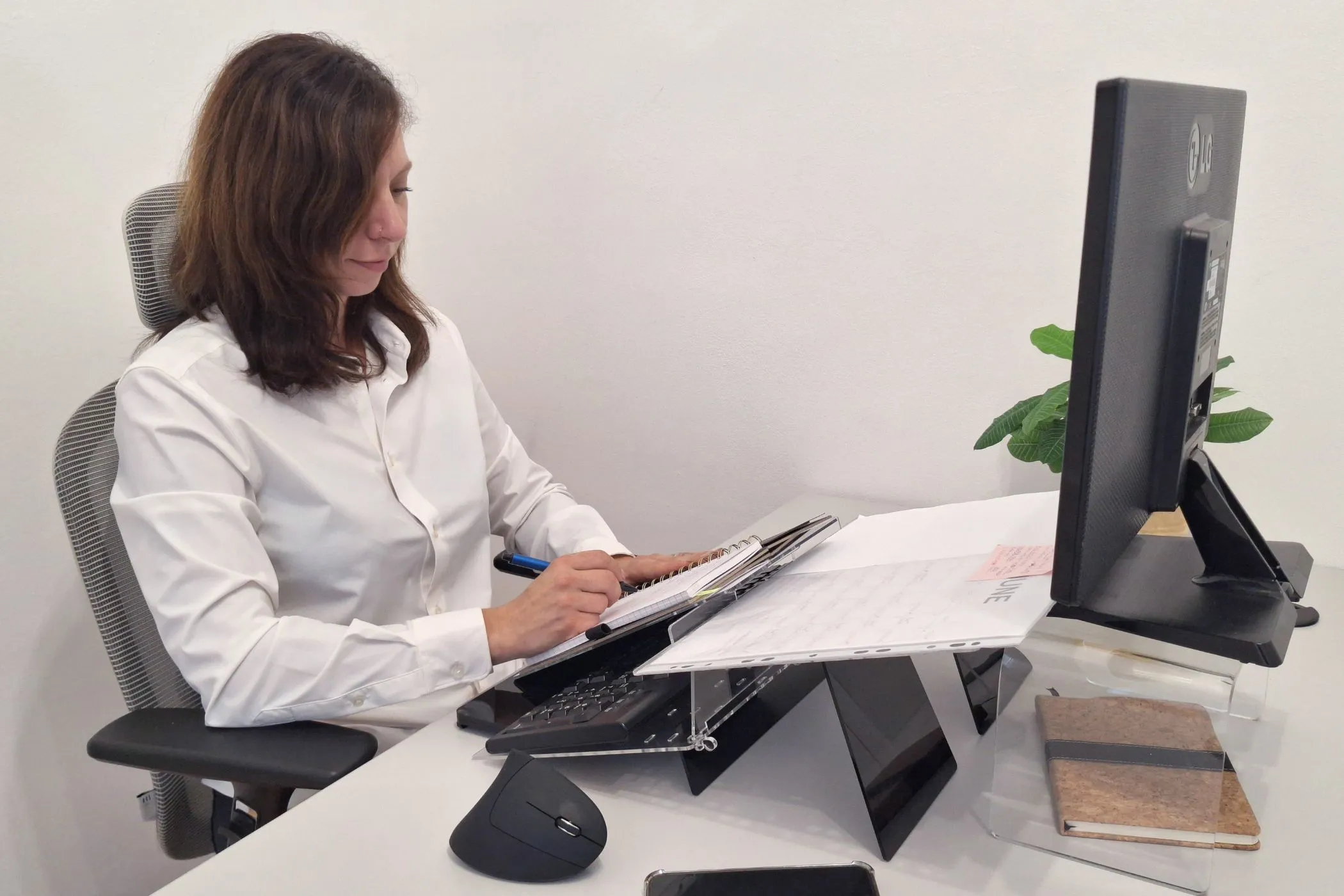 Das Modell umfasst zwei Dokumentenauflagen, eine Handballenauflage sowie eine mobile Schreibunterlage zum Schreiben über der Tastatur. Es eignet sich ideal zum Tippen, Abschreiben und für längere handschriftliche Notizen.